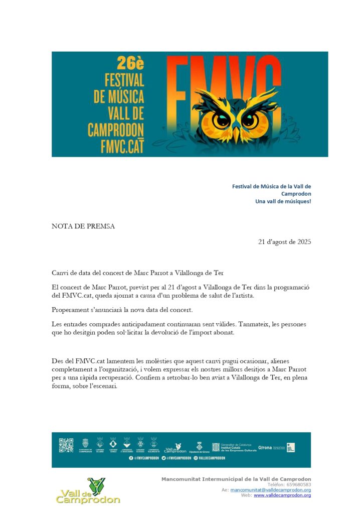 Actualitat NOTA DE PREMSA Canvi de data del concert de Marc Parrot a Vilallonga de Ter < Entrada AnteriorEntrada Posterior >